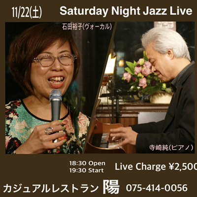 次週11/22(土)の出演はヴォーカルの石田裕子さんとピアノの寺崎純さんです。毎回安定の素晴らしい演奏を聴かせてくれます。ジャズの醍醐味をお楽しみください。