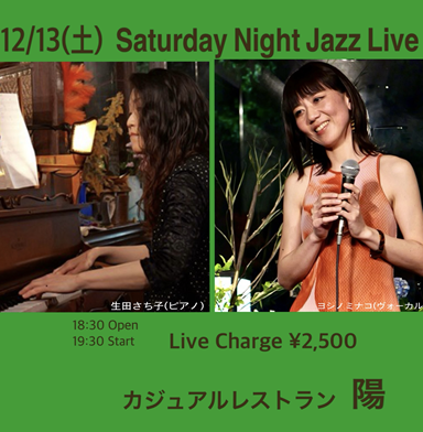 次週12/13(土)の出演はヴォーカルのヨシノミナコさんとピアノの生田さち子さんです。久しぶりの2人のステージをどうぞお楽しみに!