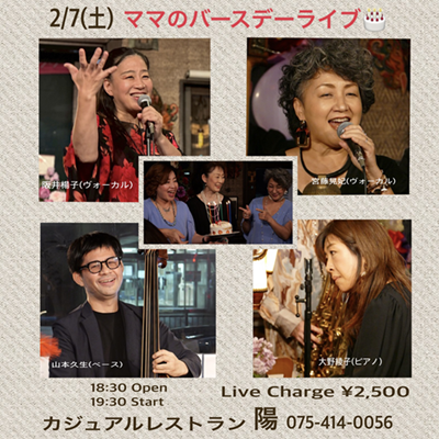 次週2/7(土)は恒例のママのバースデーライブです。出演はヴォーカルユニットGee-Babyの阪井楊子さん&宮藤晃妃さん、ピアノの大野綾子さん、ベースの山本久生さんです。今年も皆さまとご一緒に楽しい夜を過ごしたいと思います。