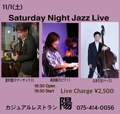 次週11/1(土)の出演は久しぶりの3人、テナーサックス里村稔さん、ピアノ串田陽子さん、ベース山本久生さんです。最近アルバムをリリースした串田さんが少しメンバーを変えてCDの曲を中心に演奏してくれます。楽しみですね。